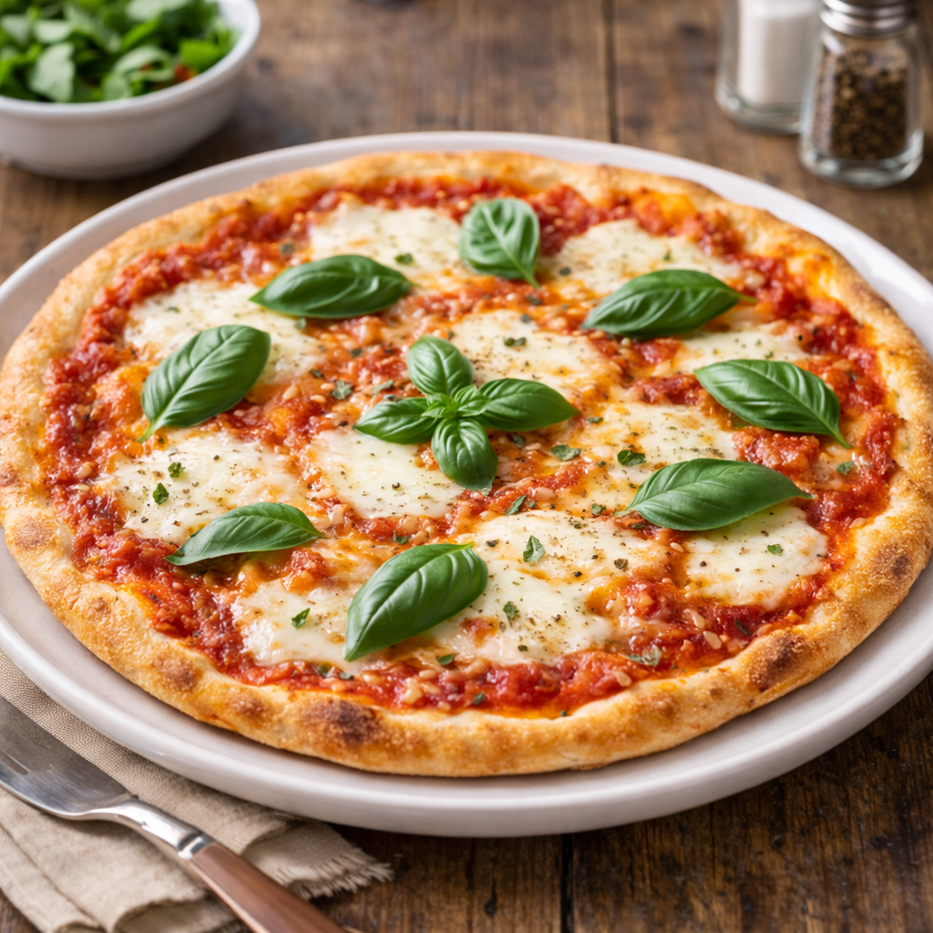 Тонкое тесто, томатный соус, моцарелла и свежий базилик. Ничего лишнего.