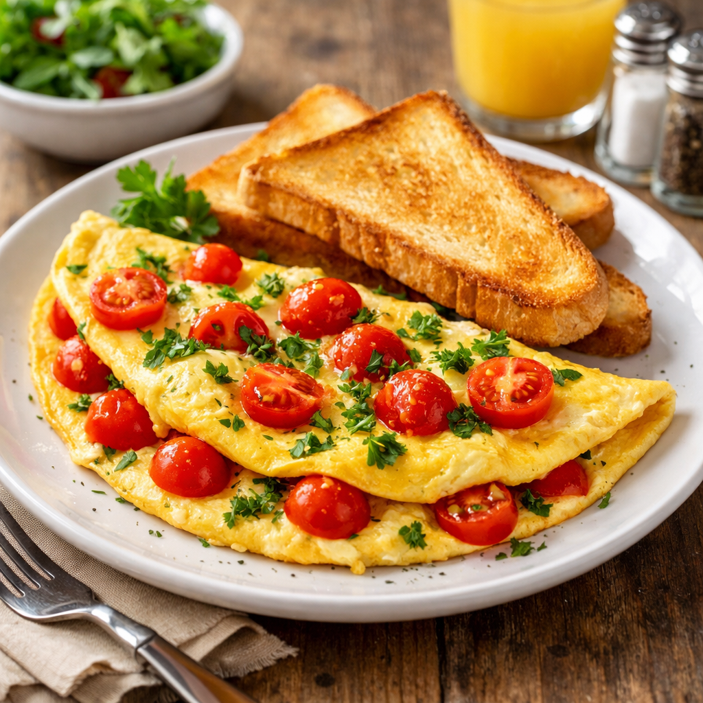 Нежный омлет из двух яиц с томатами черри, зеленью и хрустящими тостами. Идеально для бодрого начала дня.