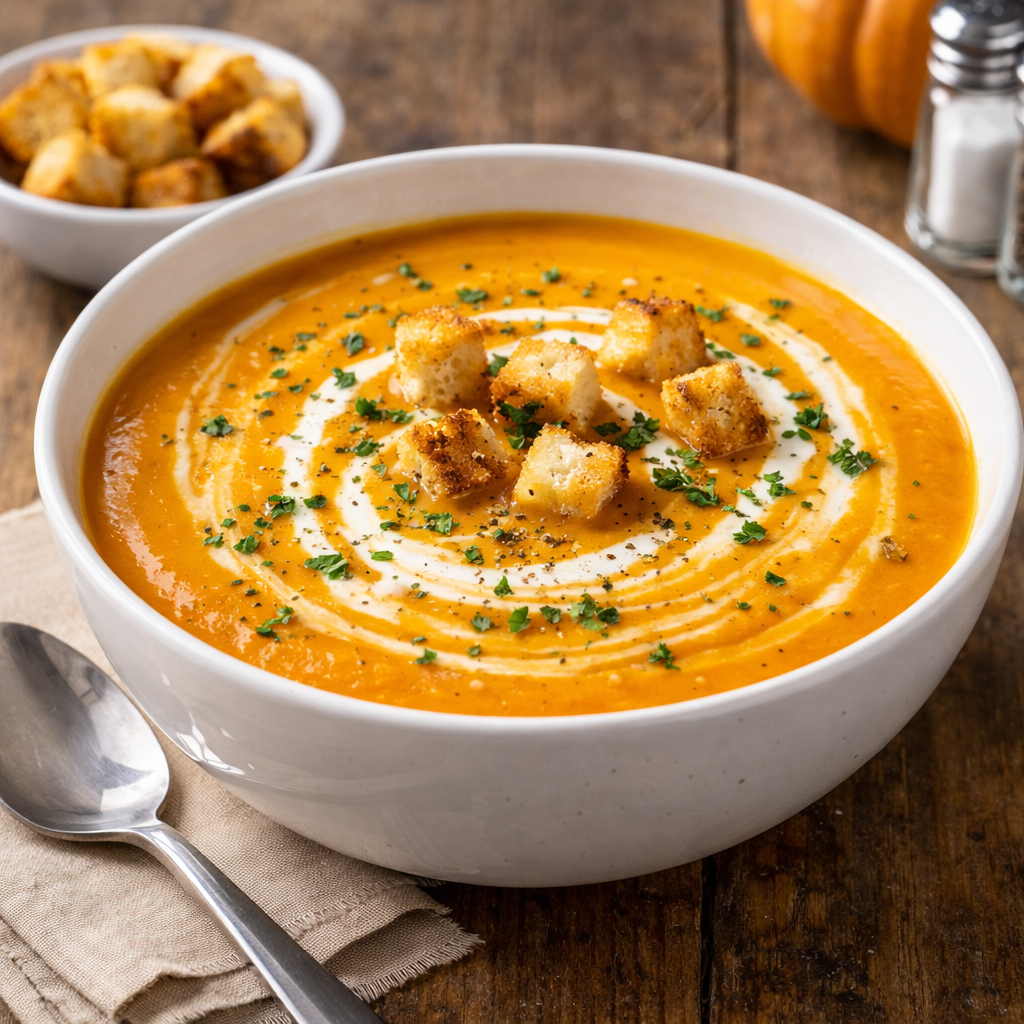 Бархатный суп из запечённой тыквы со сливками и ароматными специями. Подаётся с гренками.