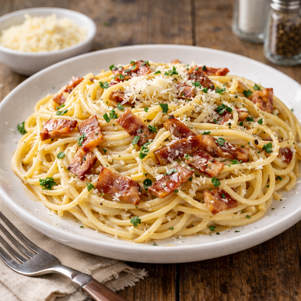 Классическая итальянская паста со сливочным соусом, беконом и пармезаном.